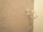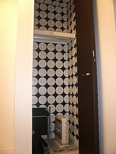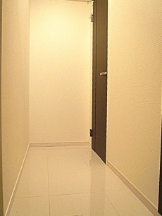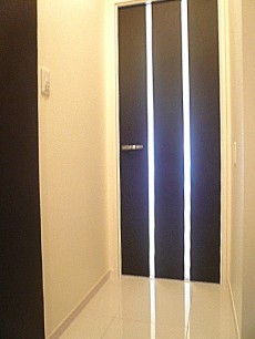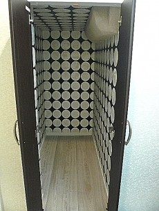 奥行きあるスタイリッシュなクロスの収納です。こちらにはゴルフバックだって掃除機だっておけちゃいそうです。収納棚を活用しかさばるタオルを置いても良いですね。
