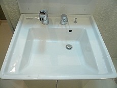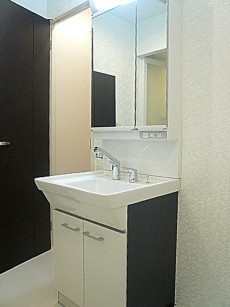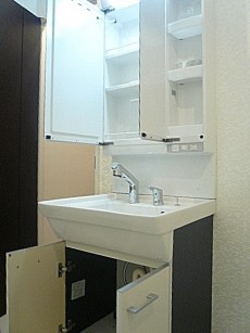 洗面化粧台です。上下に収納。ミラーキャビネットには洗顔フォームや化粧水、ヘアーブラシなどなど細々したものも整理整頓できそうです。