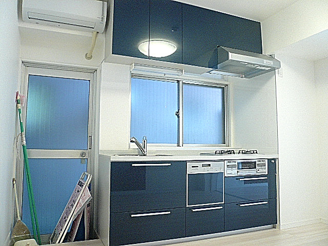 ネイビー色のスタイリッシュなシステムキッチンです。窓があり左手には勝手口もあります。