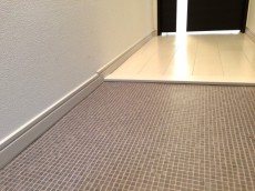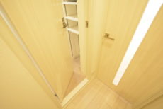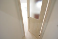 白を基調にした明るい玄関ホール。正面ドアのガラスからはお部屋の光が洩れています。ヴィンテージマンションにありがちですが、梁が少し低めですね。175cmくらいでしょうか?背の高い方は注意が必要です。
