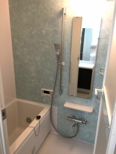 バスルームは、青い大理石模様のパネルを使った明るい雰囲気☆ミラー横のポケットにシャンプーボトルなどの小物をしまえば見た目も使い勝手もバッチリ◎