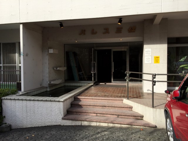 こちらがマンションのエントランスです。『パレス三條』の文字にヴィンテージ感がありますね。