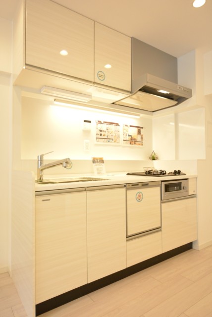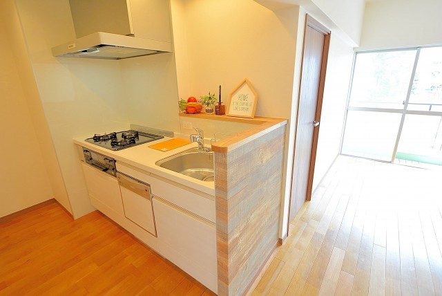 壁付けキッチンですが奥まった位置にあり独立タイプに近い印象です。食器洗浄乾燥機が付いていますので、食後はみんなでのんびり過ごしましょう♬