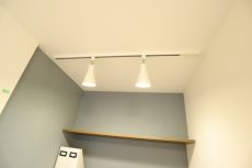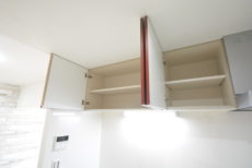収納は二つ。カウンターの下と天袋のような戸棚です。戸棚は梁との間のデッドスペースを上手く使った感じですね♪ 高い所にあるので、あまり使わない物を入れておくのが良さそうです。