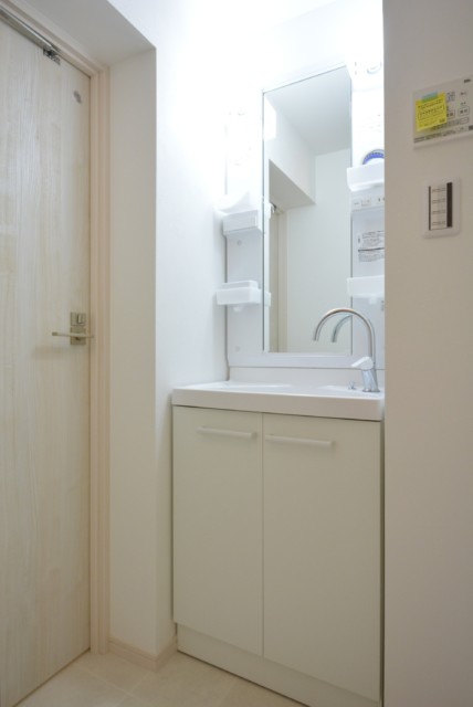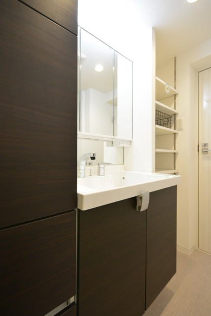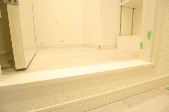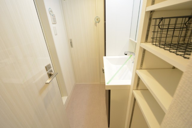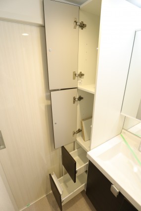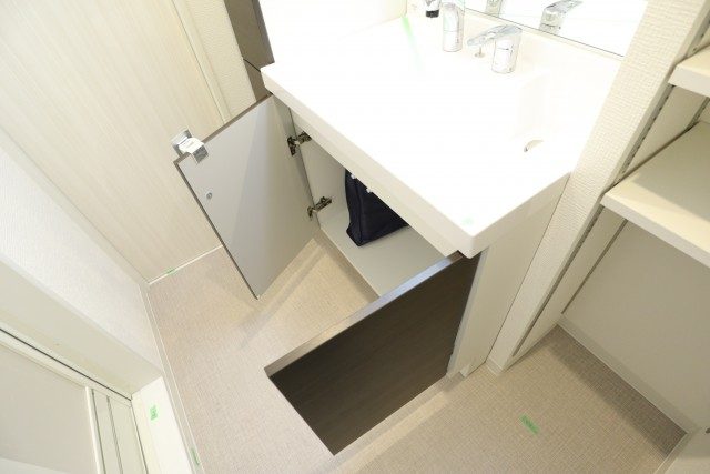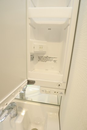 少し分かりづらいかもしれませんが、洗面台の正面にも棚があります。タオルなどはこちらでも良いかもしれませんね。