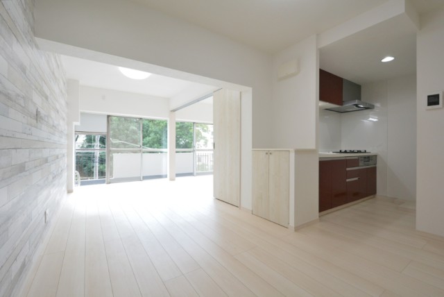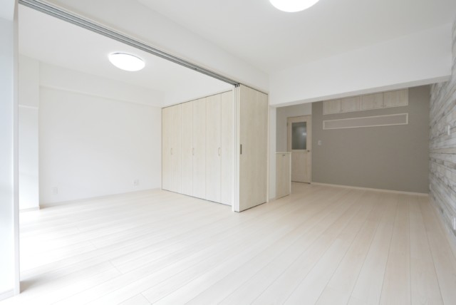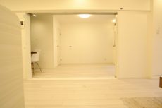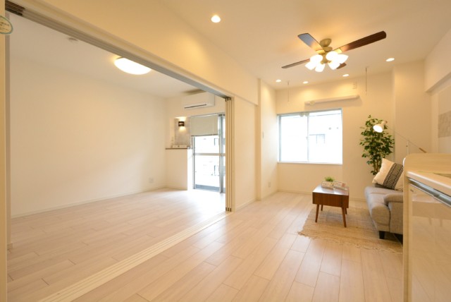 こちらは約14.4帖のリビング・ダイニング・キッチン+約5帖の洋室。仕切り戸を開けて二部屋をつなげた様子です。もちろん別々のお部屋として使う事も出来ますし、状況に応じて使い分けが出来るのは嬉しいですね。LDKとなっていますが、キッチンは奥まった所にあって独立型に近いタイプ。リビングから目立たないのはいいですね。