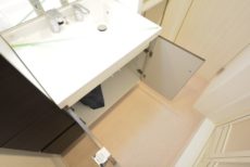 洗面台は、ミラー横にポケットが4つ、カウンター下にも収納があるので、歯ブラシ、化粧品などの小物からお掃除用具、洗剤といった物までしっかりしまえます。