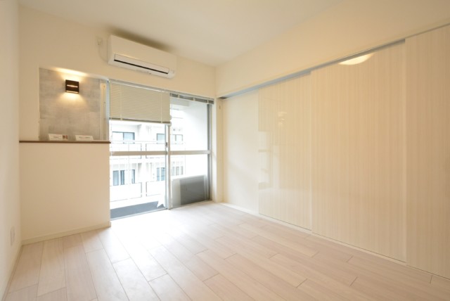 本来の約5帖の洋室に戻ります。南東向きのバルコニーに面した大きな窓があり、とても明るいお部屋ですね。色使いがシンプルで家具やカーテンのチョイスの幅も広がりそう。