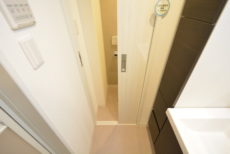 廊下右手に水回りを一か所に集めたサニタリールームです。左手手前に洗濯機置場、その奥に洗面台、正面にトイレ、右手にバスルームの並びになっています。