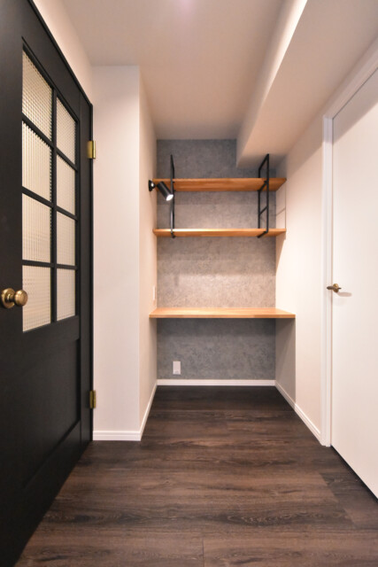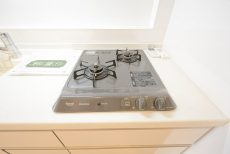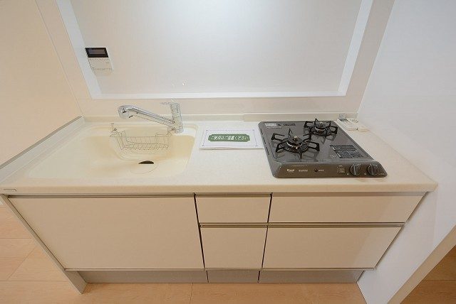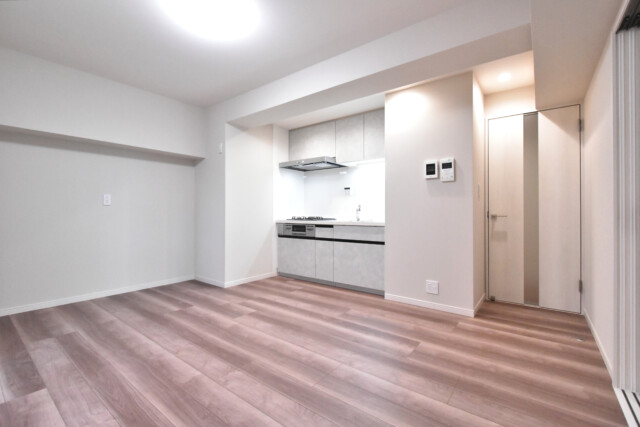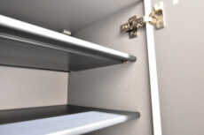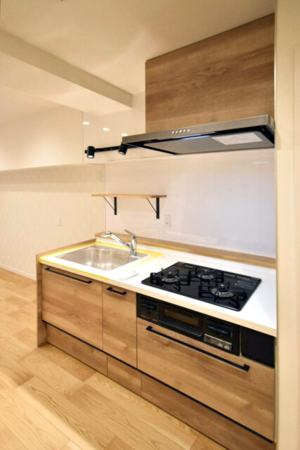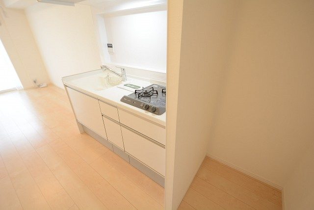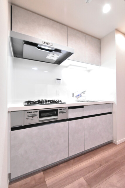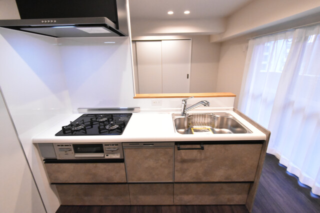 調理台はライトグレーのパネル使用。白い壁に溶け込みお部屋を広く見せています。壁付けキッチンはどうしてもキッチン内が目立つので、出来るだけ綺麗にしておきたいところです。