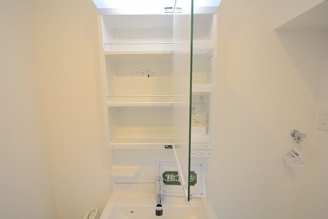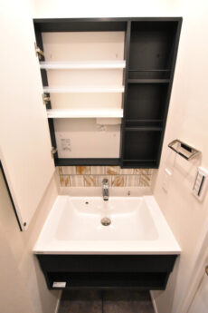 ミラーキャビネットになっているので、歯ブラシや基礎化粧品等の小物はこちらに入れることが出来ますね(・`ω´・ ○)