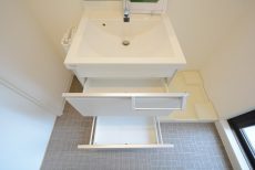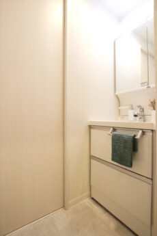 水栓はヘッドが引き出せて洗面ボウルの掃除に便利です。洗面台下やミラーキャビネットなど収納もたっぷり。特に、細々とした物で溢れる洗面周りには、細かいものを収納出来るキャビネットが重宝します。