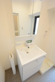 洗面室には洗面化粧台の他に、トイレ、洗濯機スペース、浴室がまとまっていて脱衣場も兼ねています。浴室には浴室換気乾燥機が付いていますので、天気を気にせず洗濯機を回せますよ。