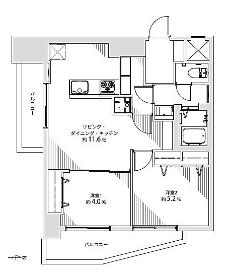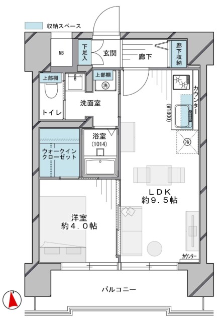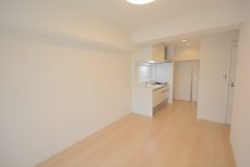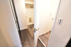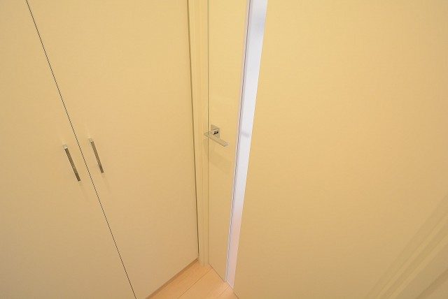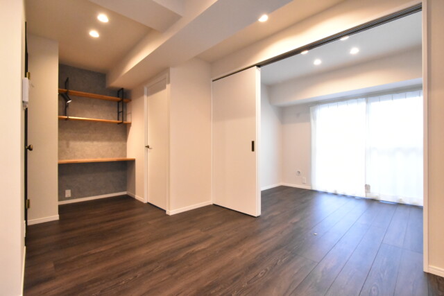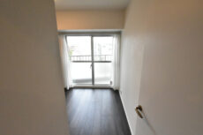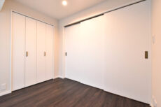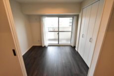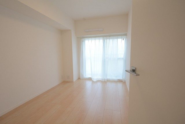 LDKと同じ南向きバルコニーに面しています。コンパクトなお部屋ですが、柱などのない綺麗な形、入口にデッドスペースのできない引き戸使用など、数字以上に広く使える印象です。