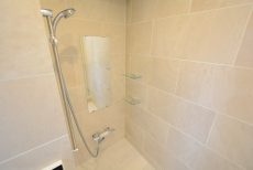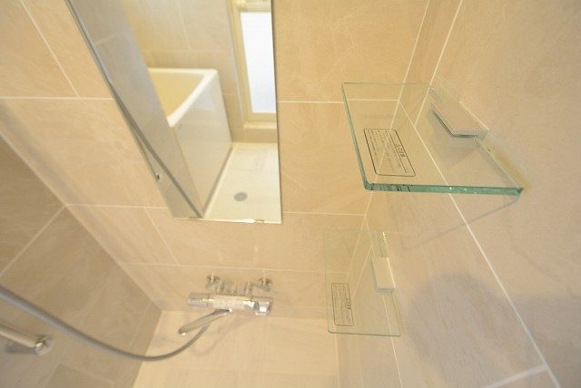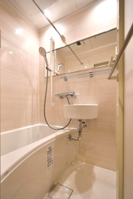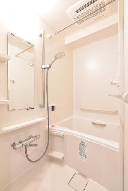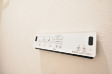 洗面台は浴室内にあります。浴槽側に張り出している洗面台をよく見かけますがここはそんなこともなく、ゆったりと湯舟に浸かれますね。追い焚き機能が付いているので長風呂しても大丈夫ですよ。天候気にせず洗濯が出来る浴室換気乾燥機付き!