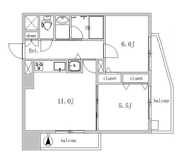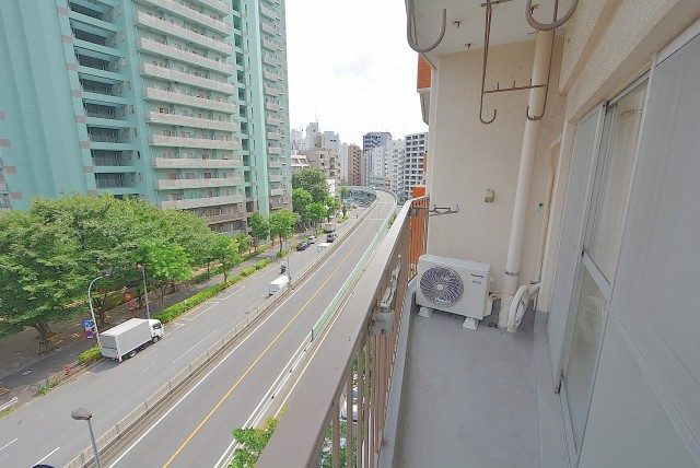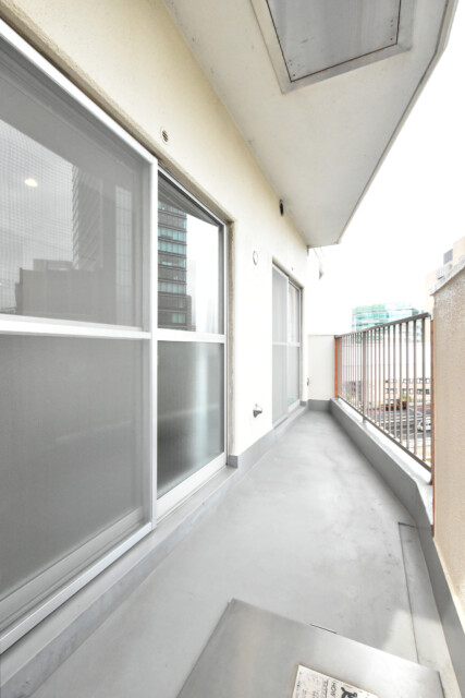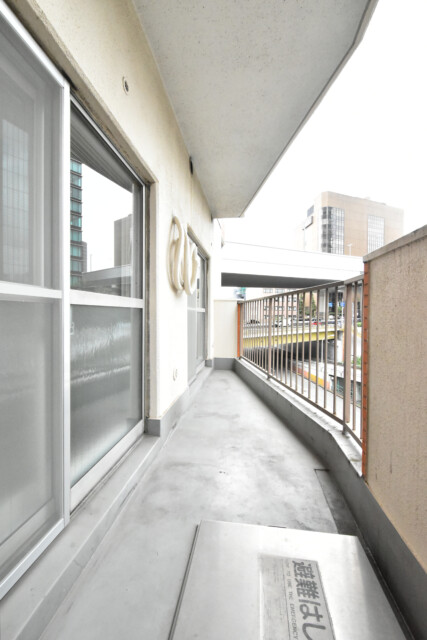 片側が狭くなった5角形のバルコニー。幅があって南側のバルコニーよりだいぶ広く感じます。壁が白いのもあるかもしれませんね。
