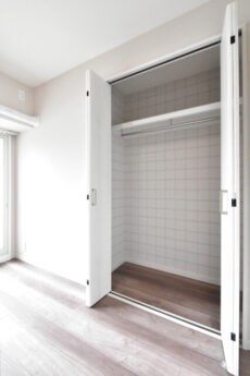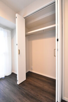 クローゼットはややコンパクト。この大きさだと別に収納家具が欲しいと思う方もいらっしゃると思いますが、ダブルベッドにしてもスペースは十分残るのでご安心ください。