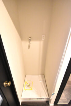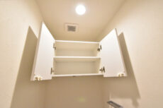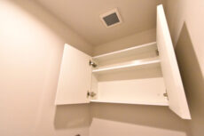 キッチン横には洗濯機置場。洗面室にあるイメージが強いですが、最近はキッチンや廊下で見かけるようになりました。しっかり扉が付いていて見た目には全然わからないようになっていて、使った方からは「意外と使いやすい」という声も聞かれます。洗剤などが置けるよう中に棚が付いているのも便利でいいですね♪