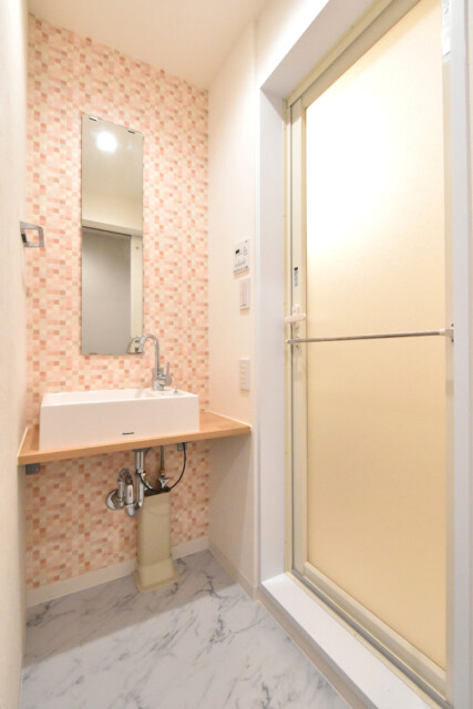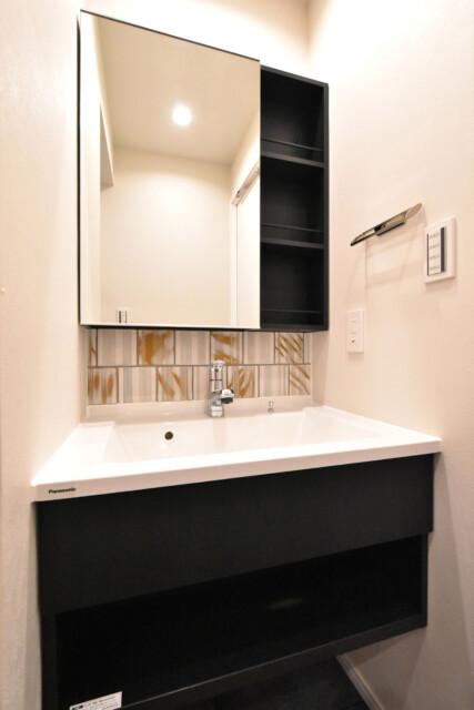 洗面台はシンプルでスタイリッシュ。アクセントのタイルがいい味出しています。