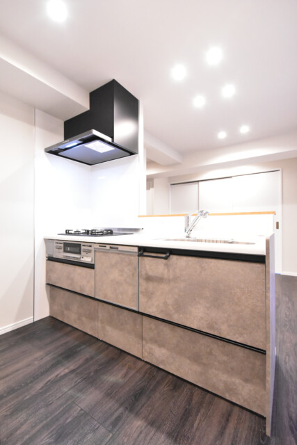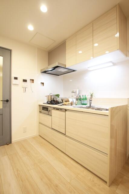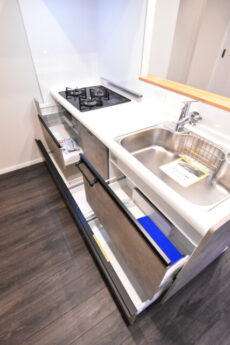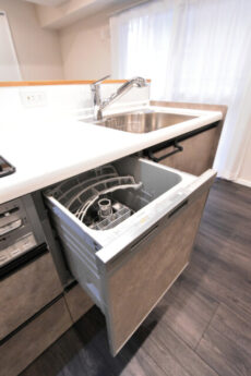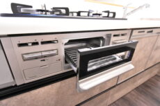 場所をとらずにお部屋を広く使えるキッチンです。そんな壁付けキッチンの弱点は丸見えという点。常日頃から綺麗にする努力が欠かせません。トップになるべく物を置かなければ、掃除もしやすく見た目もスッキリするのでお勧めですよ。木目パネルのシステムキッチンには、食器洗浄乾燥機や浄水機能一体型水栓などアシスト機能も充実しています。