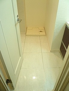 右から洗面化粧台、正面に洗濯機置き場、左にバスルームとなっています。