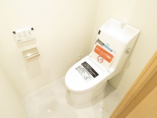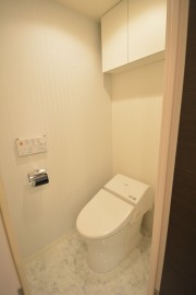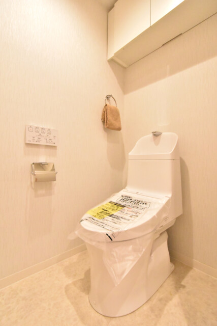 トイレはTOTO製の洗浄機能一体型。トイレットペーパーや掃除道具を入れるのに便利な吊戸棚も付いています。