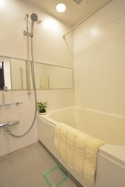 ホワイト基調で明るく清潔感のあるバスルーム。