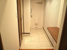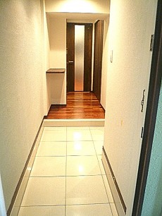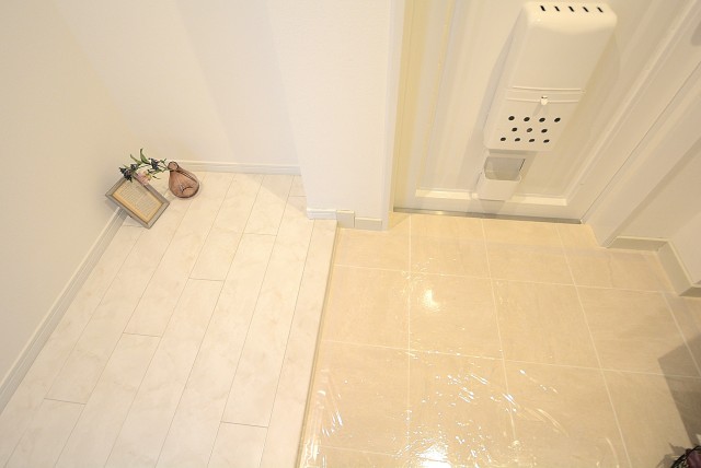 玄関をあけますと、目の前に見えた景色はホワイトなタイル、縦に広々とした玄関ホールです。