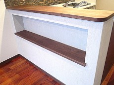 ウッドのカウンターもあり、出来上がった料理もこちらに並べられたりと使い勝手も良さそうです。カウンター下には棚も!