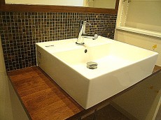 南国のホテルのような洗面化粧台です。スタイリッシュな洗面ボウルとアクセントタイルがマッチしています。調整可能な右側にある棚には細々したものが置けます。見える収納なので、キレイにする意識を自然に持てそうです!