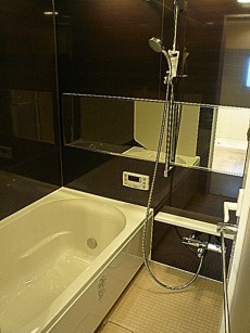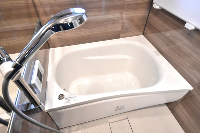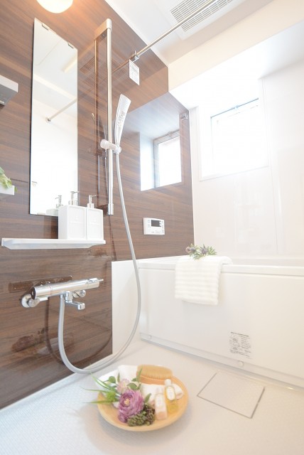 浴室乾燥付きバスルームです。濃いブラウンの浴室パネルは、リラックスできる空間になりそうです。浴室乾燥、梅雨の季節の洗濯物も天候気にせず干せたり、寒い冬の入浴前の温度差を調整したりと助かる機能ですね。