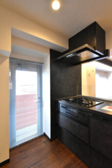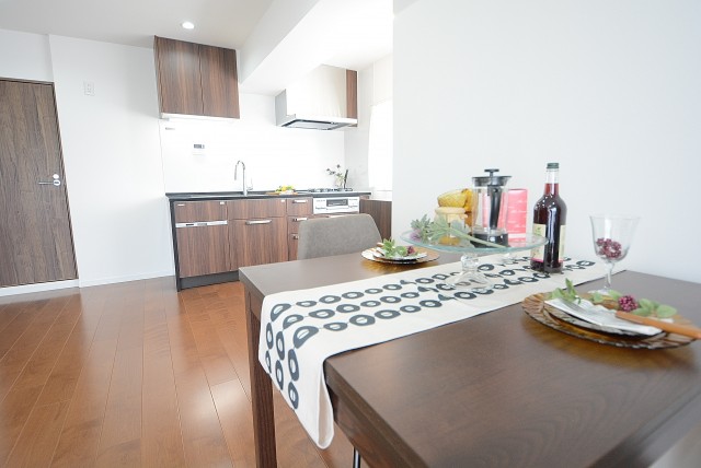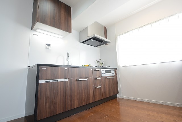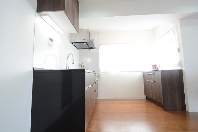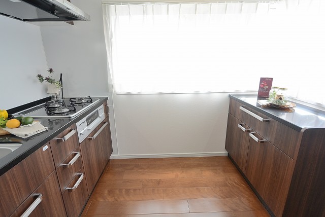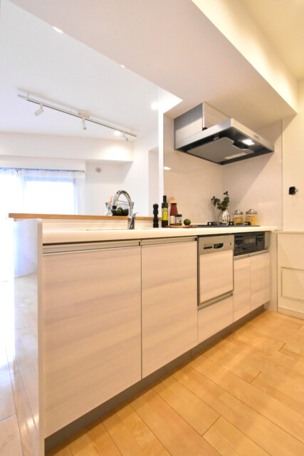 開放的でリビングダイニングとの一体感が人気の理由です。調理台には木目パネルが使われお部屋の雰囲気にもピッタリですね。コンロ前はしっかりパネルでガードされているので、油跳ねを気にする必要もありませんよ。