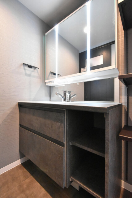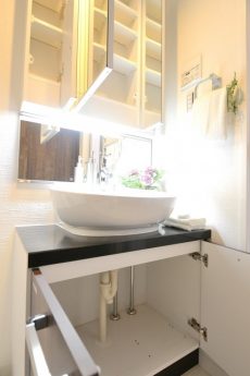 3面鏡の裏が収納になっている洗面化粧台。