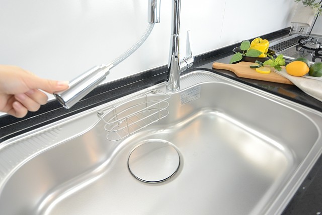 システムキッチンはワークトップが人工大理石。浄水機能付きシャワー水栓に