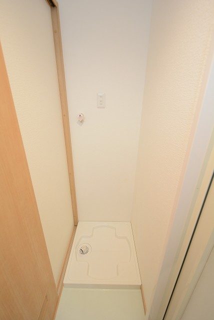 左側に浴室、正面に洗面化粧台、右奥に洗濯機置き場があります。