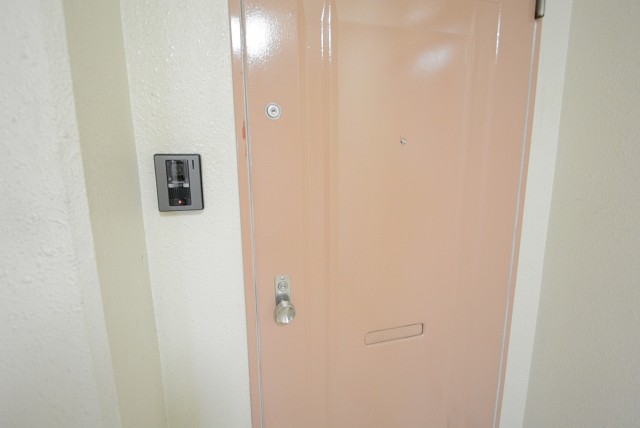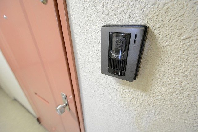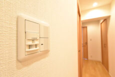 今回のお部屋は外廊下部分。カラフルなドアが並んでいますが玄関は赤い方です。ドア横にはモニター付きインターホンが付いていて、お部屋の中から玄関前の様子を確認することができるようになっています。わざわざ玄関まで来なくてすむのは助かりますね。