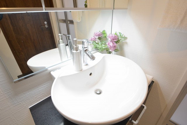 洗面化粧台は三面鏡付。鏡裏のキャビネットは、洗面周りの細々としたものを収納するにはぴったりですね。水栓はヘッドの引き出せるタイプ。洗面ボウルを流したりに便利ですよ。