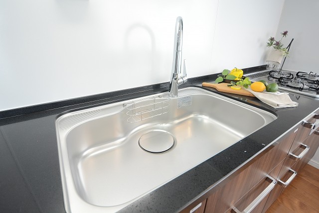 蛇口一体型の浄水器付き、お掃除も楽チンですね。シンクや調理スペースも広々とあり、