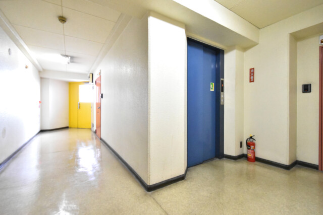 エレベーターを2階で降りてお部屋へ向かいます。2階なので、健康維持のために階段を利用するのもいいかもしれませんね。エレベーターホールにも玄関が並んでいますが…