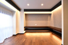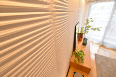 広さは十分ですが、レイアウトによっては無駄なスペースができてしまうので注意が必要です。正面上部には間接照明を設置。立体的なアクセントパネルをより際立たせていますね。