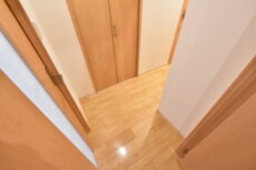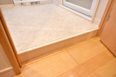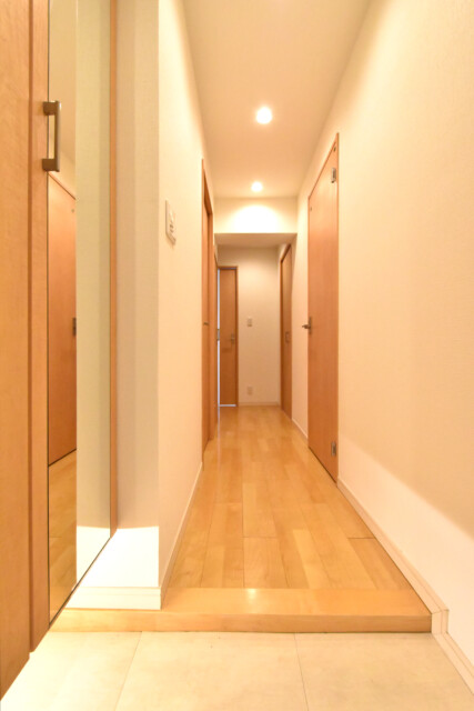 玄関から続く廊下は中間調の木目を多用した落ち着いた雰囲気。突き当りのドアが少し左へずれていて戸口から室内が見えづらくなっています。宅配便やフードデリバリーなど訪問者の多い時代ですからこれは嬉しいですね。上り口はバリアフリーを意識した段差が小さめなタイプ。
