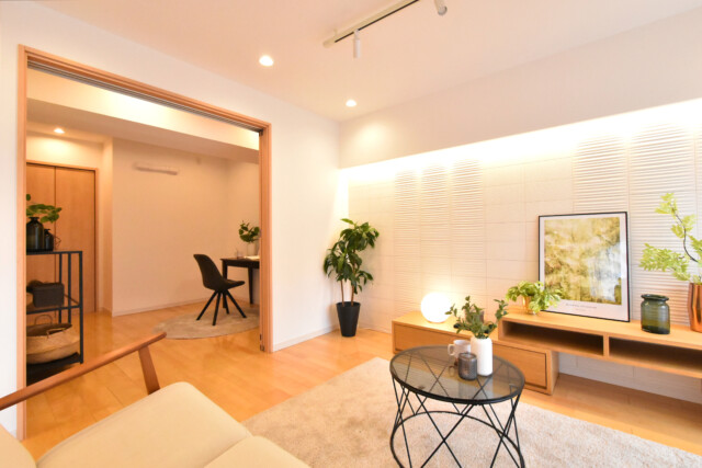 ナチュラルな色合い&木目のフローリングと白いクロスでシンプル&明るい室内。