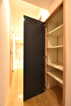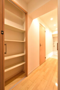 廊下を進んだ左右には収納棚が二つ。片方は奥行が浅いタイプ、もう片方はそこそこの奥行があります。それぞれメリットデメリットがありますので上手く使い分けましょう!