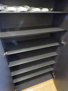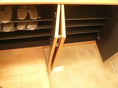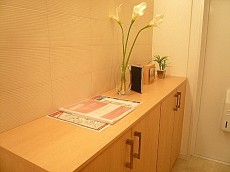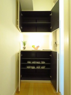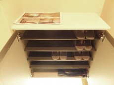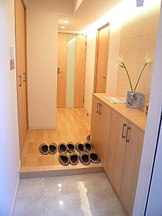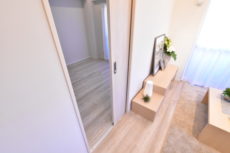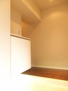 玄関をあがると廊下があり、その先にシューズBOXが設置されています。一人分の手持ちの靴なら大体この中に納まるのではないでしょうか。中央部分はカウンターになっているので、小物を飾ったり、鍵の置場にしたりと色々便利に使えそうです。