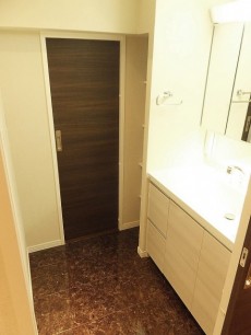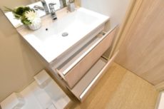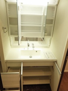 収納は三面鏡裏のキャビネットと洗面台下。細々した物が多くなりがちな洗面廻りには豊富な収納が有り難いですね。大きな物から細かい物までバランスよく収まりそうです。