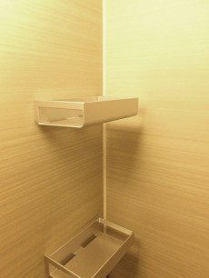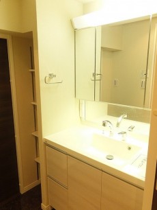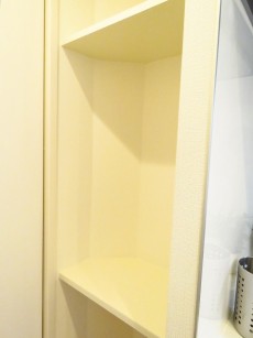 洗面台左側にあります棚です。かさばるバスタオルなどの収納に便利です。
