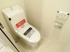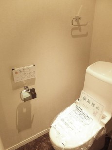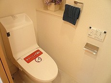 トイレはウォシュレット付き。上に物置棚が設置されています。