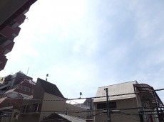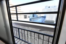 南東向きの窓の外はちょうど隣のビルの屋上の高さ。遮るものもなく午前中を中心に陽当りは良さそうですね。防犯を考えて格子も設置されています。