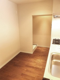 キッチン奥のスペースには、洗濯置き場と横幅のある棚付き収納があります。