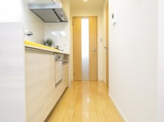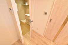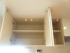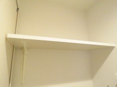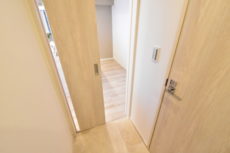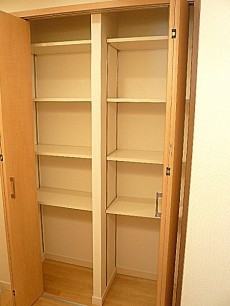 キッチンの横には棚付きの物置き場、奥には掃除機を入れて置くのによさそうな物入が設けられています。